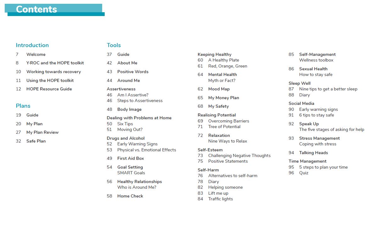 - Y•Toolkit - Personal plans and wellbeing tools specially designed for a younger audience hat link to Y•ROC and promote recovery.